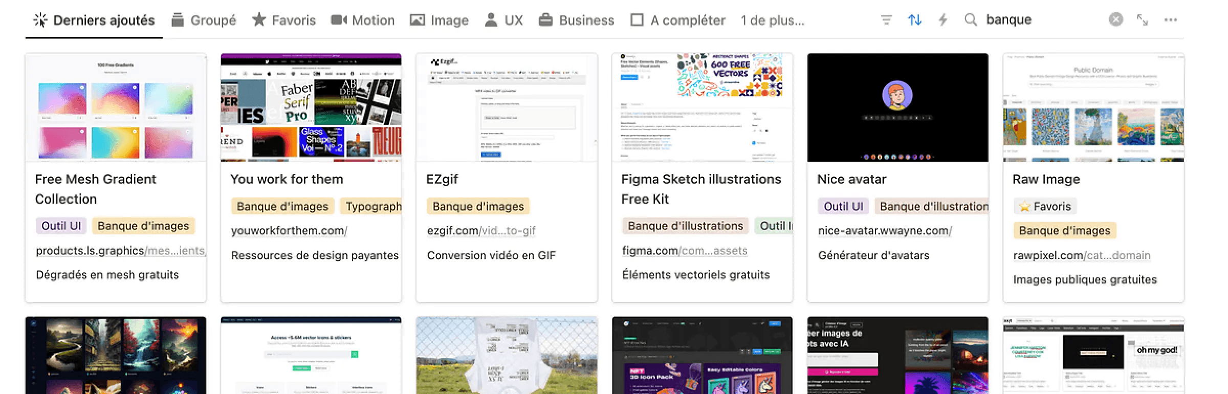 J’ai finalement trouvé l’outil idéal : Notion 🤗. Il offre des fonctionnalités de filtrage, de disposition et de recherche, tout en restant simple à éditer. C’est un bon compromis entre le temps nécessaire pour ajouter un favori et le résultat obtenu.